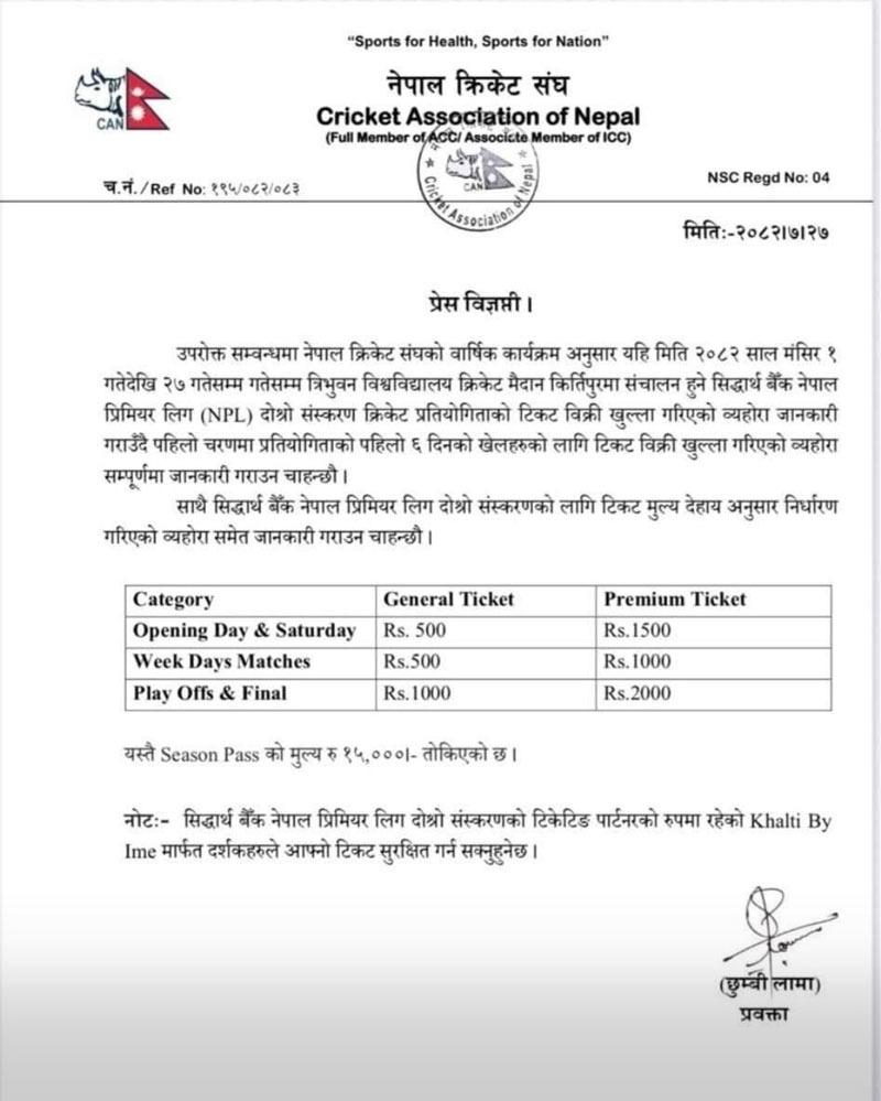 मंसिर १ गतेदेखि २७ गतेसम्म सञ्चालन हुने यस क्रिकेट महाकुम्भलाई नजिकबाट नियाल्न चाहने दर्शकहरूका लागि क्यानले पहिलो ६ दिनको टिकट बिक्री समेत खुल्ला गरेको छ। एनपीएल सिजन २ को टिकट मूल्य साधारण खेलका दिनहरूदेखि प्लेअफ र फाइनलसम्म फरक-फरक तोकिएको छ।