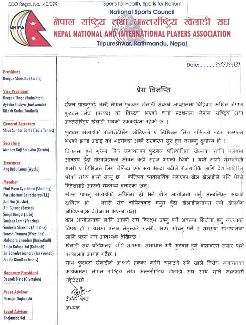 संघका अध्यक्ष दीपक श्रेष्ठले शुक्रबार विज्ञप्ति प्रकाशित गरेर फुटबल खेलाडीको रोजीरोटीसँग जोडिएको ए डिभिजन लिग पछिल्लो पटक सम्पन्न भएको झन्डै अडाई वर्ष भइसक्दा अर्को संस्करण सुरु हुन नसक्नु दुर्भाग्य भएको जनाएका छन् ।